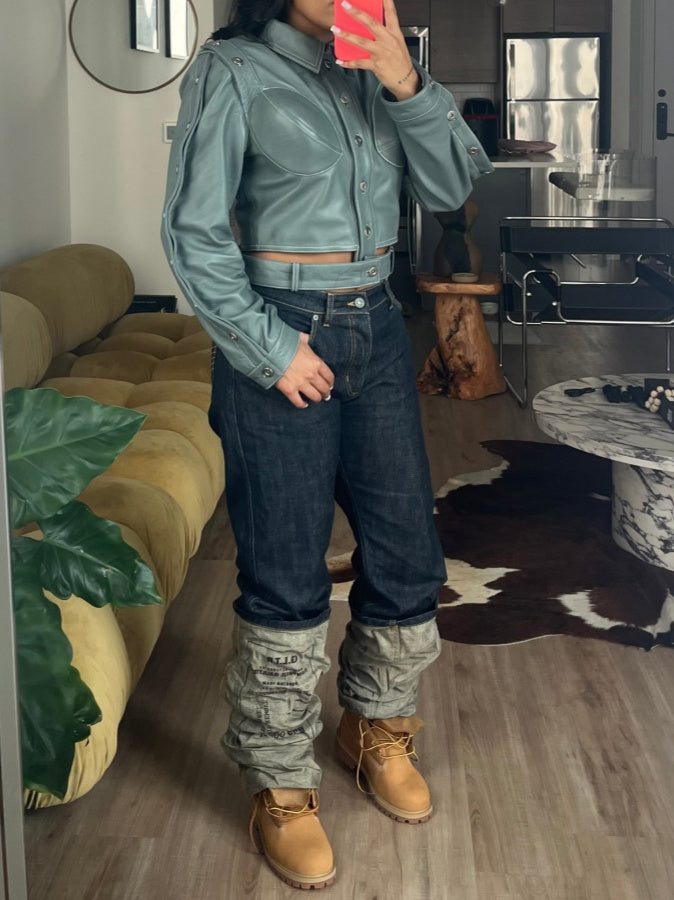 Comes with a belt that snaps on and off on last button for style preference of a shirt/jacket.