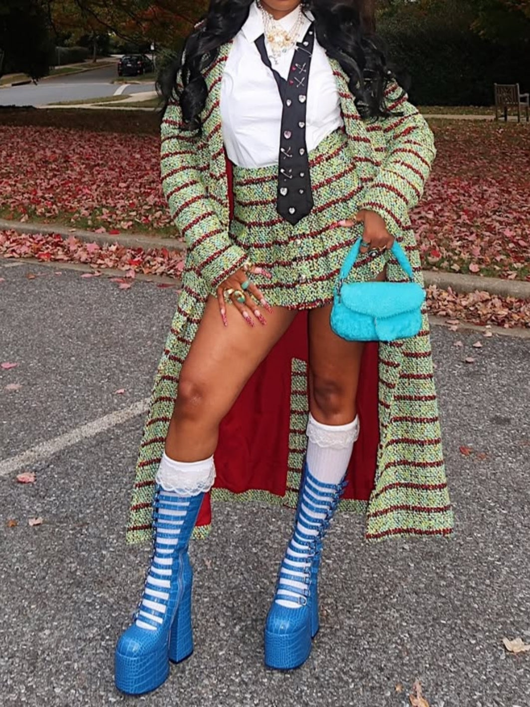Crafted from cozy woven tweed, this playfully elegant jacket features a colorful plaid pattern with golden metallic detailing interwoven throughout, a notch lapel collar, long sleeves, a double-breasted front closure with ornate silver-tone buttons, dual waist pockets, a coordinating adjustable waist belt, a back vent slit, and a sleek inner lining. Complete with a longline silhouette.