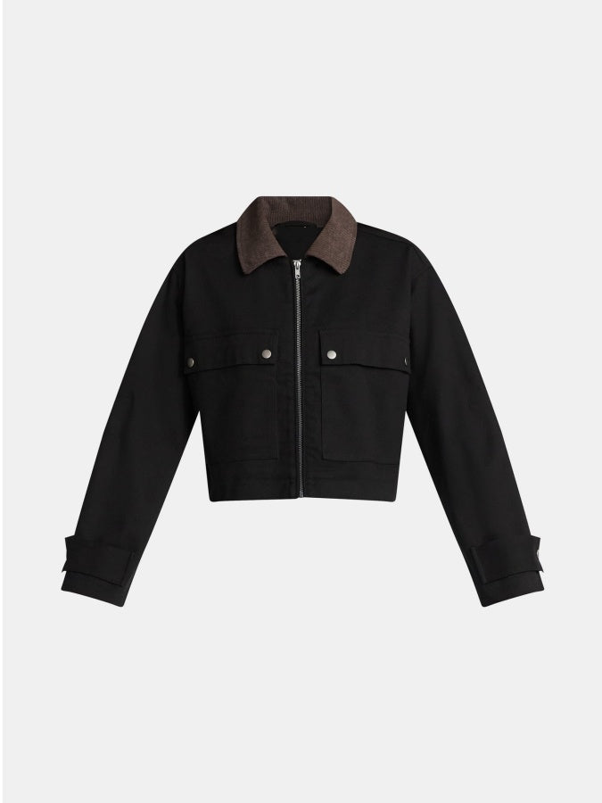 - Features: Contrast corduroy collar; lapels on sleeves; soft twill