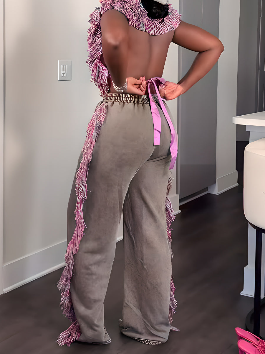 Crafted from layers of shaggy, multicolor fringe yarn, this fringe blouse features a deep V-neckline, a sleeveless design, an exposed lower back with a satin self-tie ribbon, and a coordinating satin inner lining. Complete with a snug, waist-length silhouette.