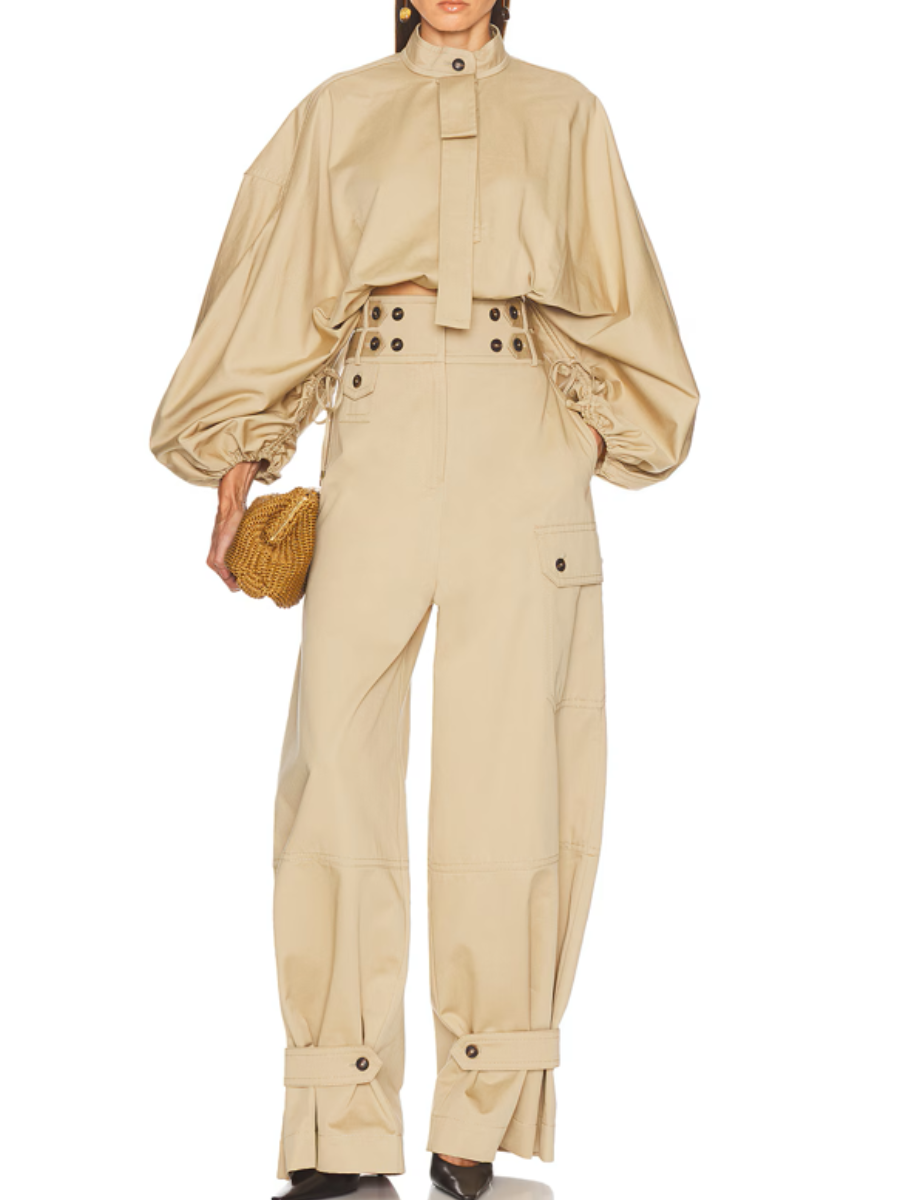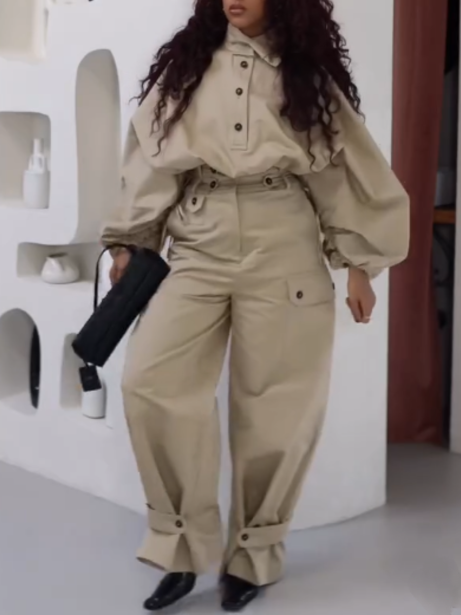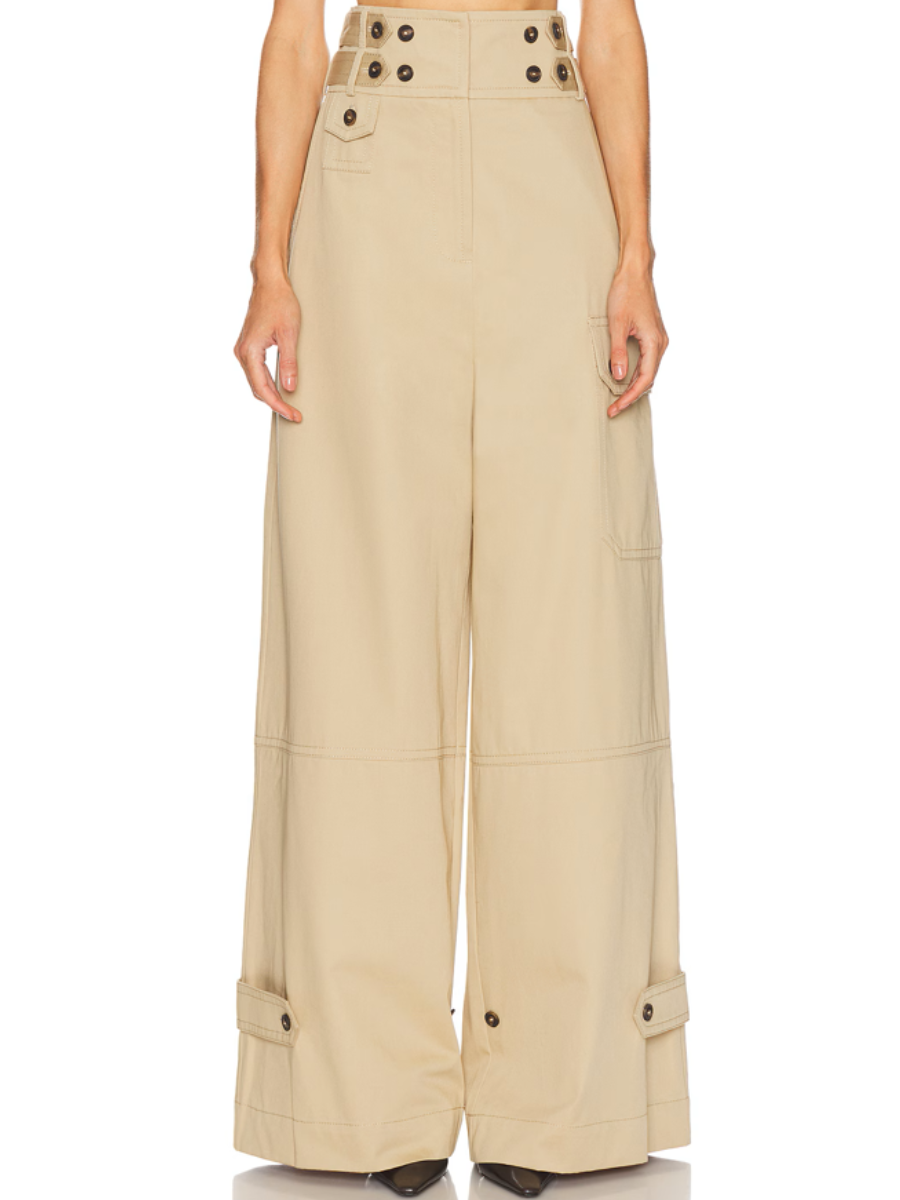 - Side adjusters with button fastening at waist and ankles