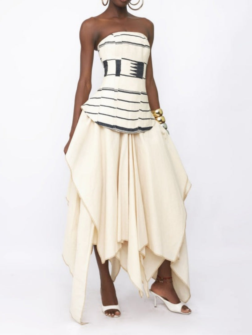 The corset top provides a sculpted fit that accentuates the waist, while the layered skirt flows with organic movement, creating an effortlessly dramatic silhouette.