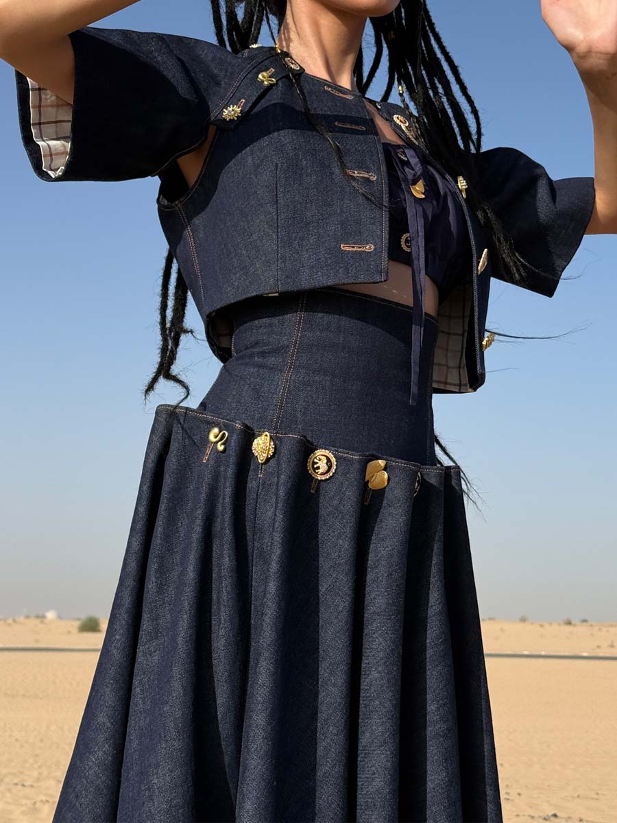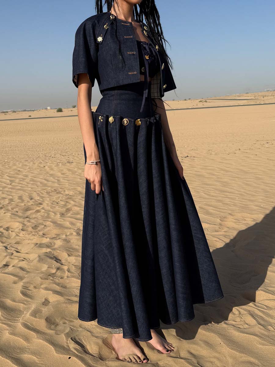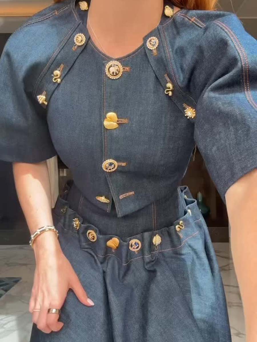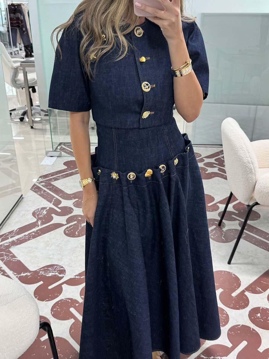 Elegant Metal Button Denim Two Pieces Dress