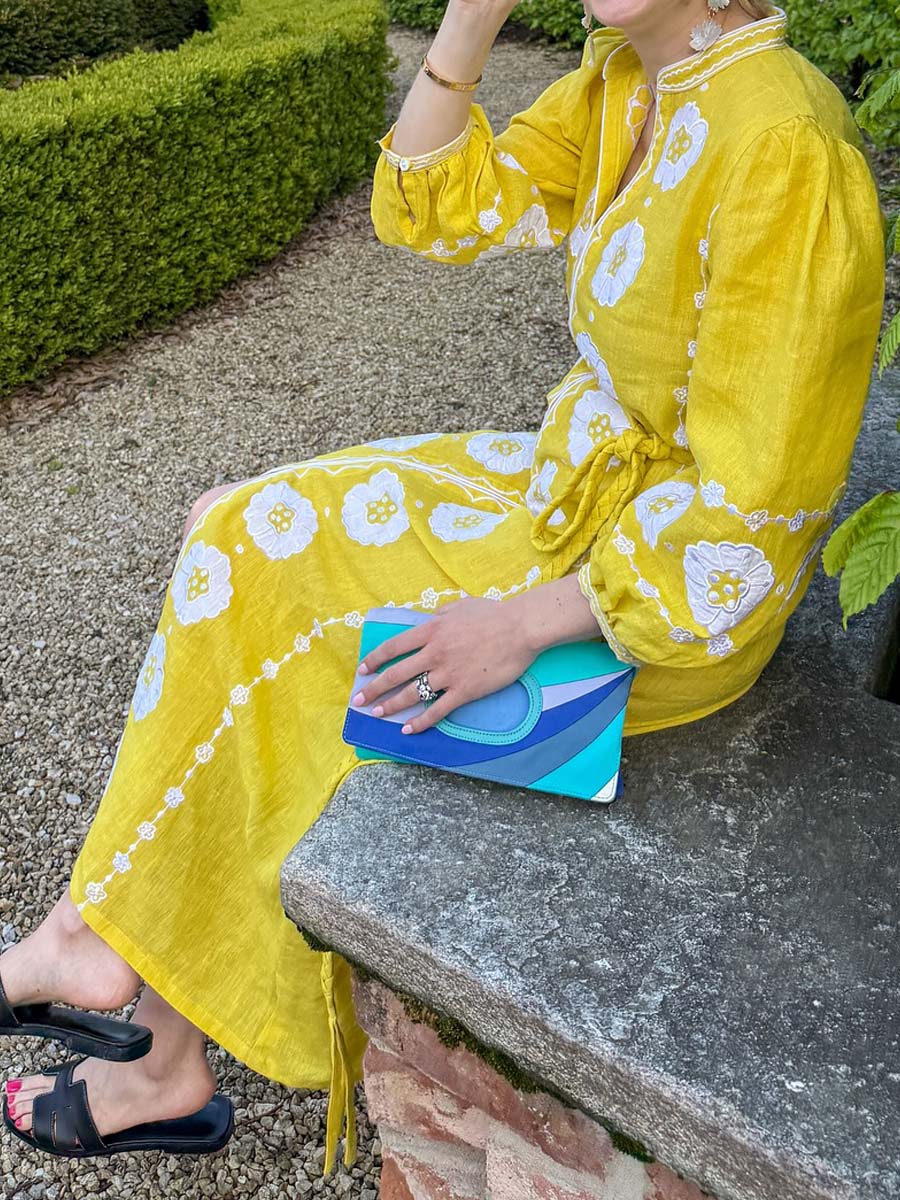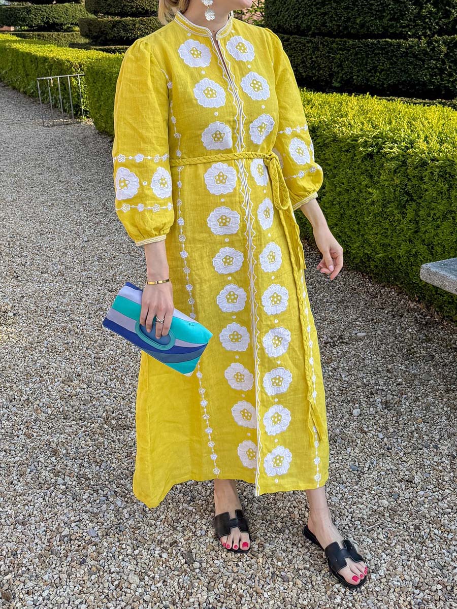 The dress has a sunny silhouette that embodies the serene beauty of resort life. The yellow linen drapes effortlessly, creating a feminine and flattering fit.