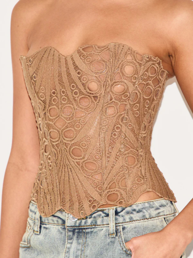 Our Corset is where couture artistry meets modern femininity. Designed with a sculpted silhouette and intricate cutout embroidery, this strapless piece flatters your figure while making a bold style statement. The structured design offers light support and a cinched waist effect, highlighting your natural curves with elegance.