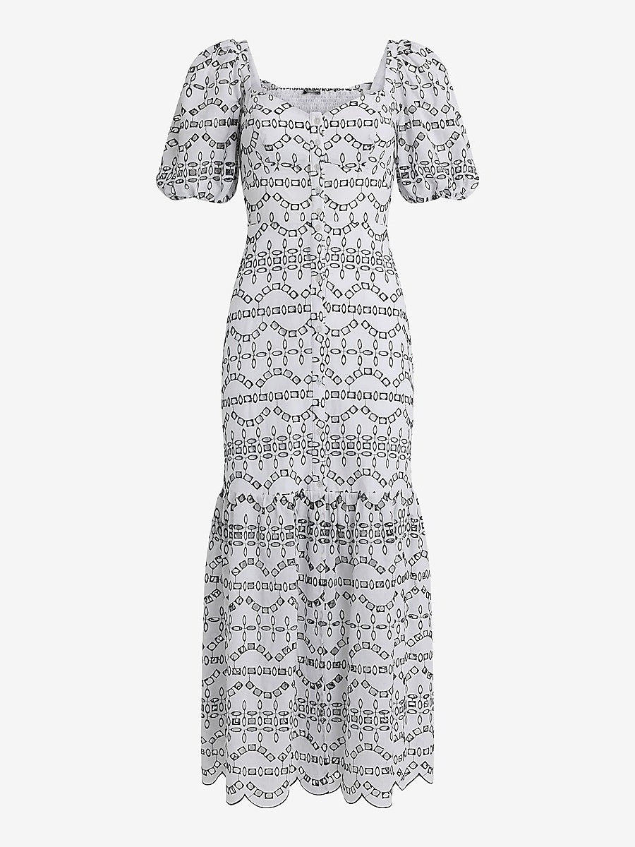 A chic geo eyelet maxi dress crafted from breathable cotton. This tiered style features puff sleeves, a sweetheart neckline, and a button front.