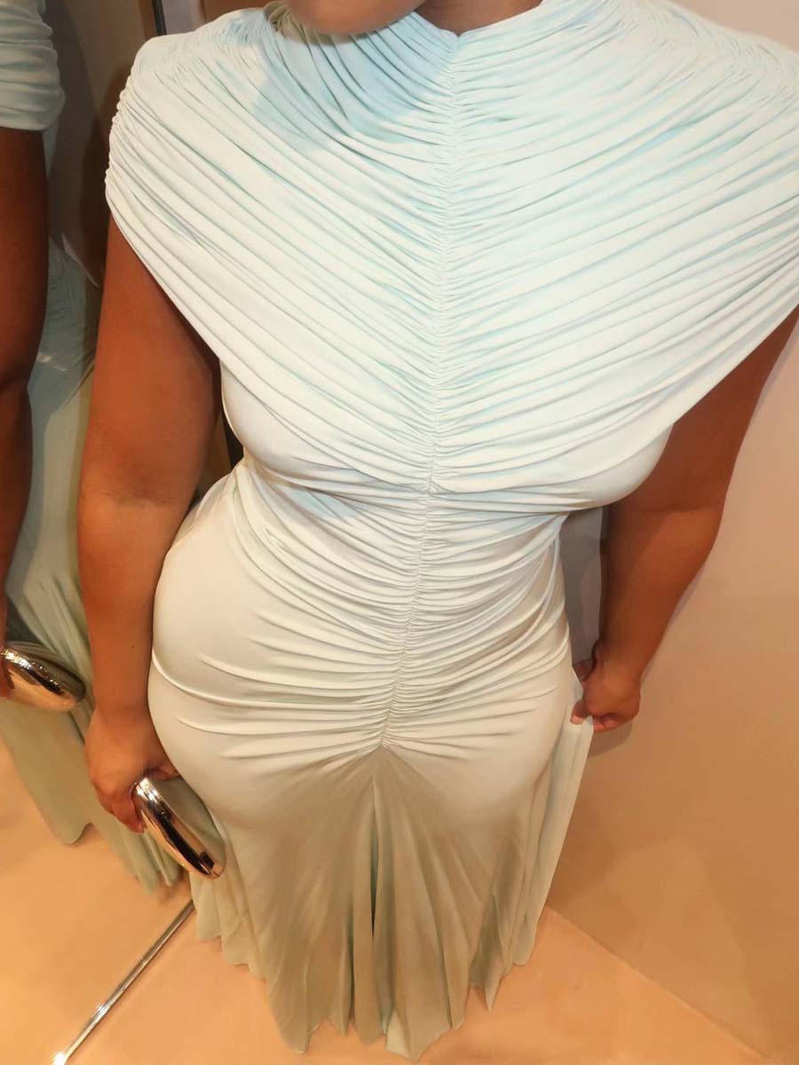The dress is artfully ruched throughout to accentuate your natural frame. It’s made from soft jersey that fits close through the body and falls to a softly pleated hem. Wear yours with strappy sandals.