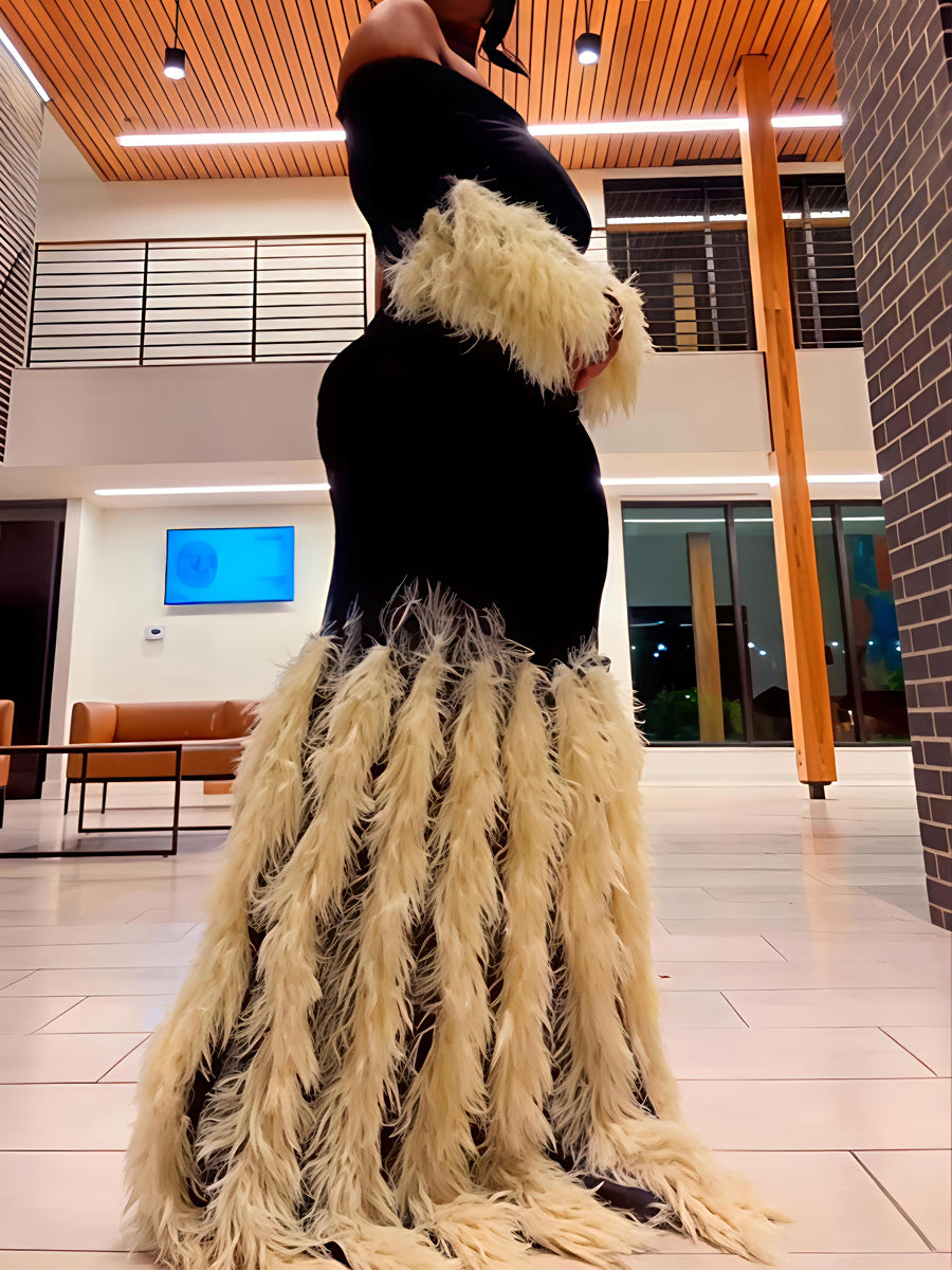 Feather Tirm Off Shoulder See-through Maxi Dress