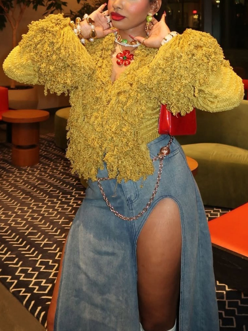 The Cropped Cardigan adds the perfect texture to any look. She is finished with a curly tassel detail that cascades down the front, and wraps around the wrists.