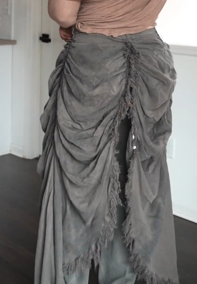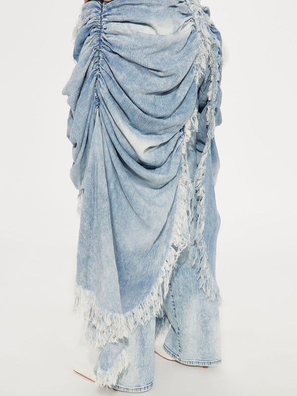 These statement jeans are crafted from light-wash denim with acid wash detailing and feature a high-rise fit, functional belt loops, exaggerated ruched fabric overlay panels that drape down the legs, and ultra-raw fringe trim detailing. Complete with a classic front zip fly, and a skinny leg silhouette. Style with a minimal top and let the pants do all the talking.