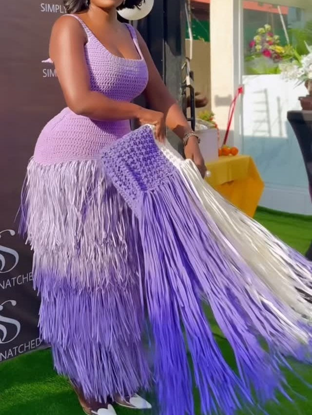 The dress is designed with a hand-crocheted bodice balanced by a dramatic, tiered raffia skirt. A scooped square neckline with a hidden center back zipper which ensures a seamless finish.