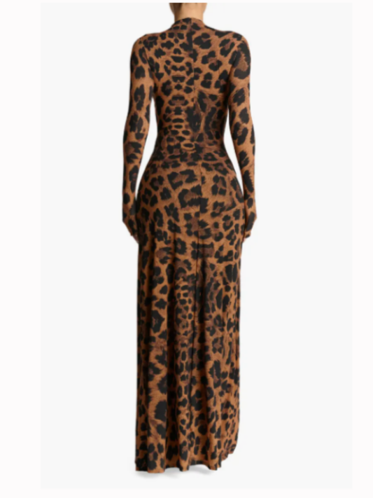A stretch-enhanced construction is fitted at the bodice and flowy at the skirt of this chic leopard maxi dress that's sure to turn heads at your next night out.
