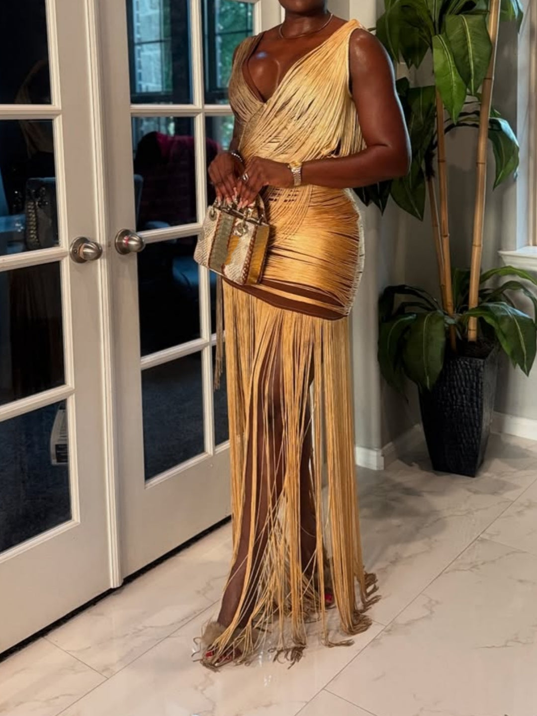 Draped in charming allure, this fringe dress is a show - stopper. The plunging neckline adds a touch of seduction, while the cascading fringes bring dynamic movement with every step. Crafted for those who dare to stand out, it's not just a dress — it's a statement of bold elegance. Pair it with a chic mini bag, and you're ready to own the night.