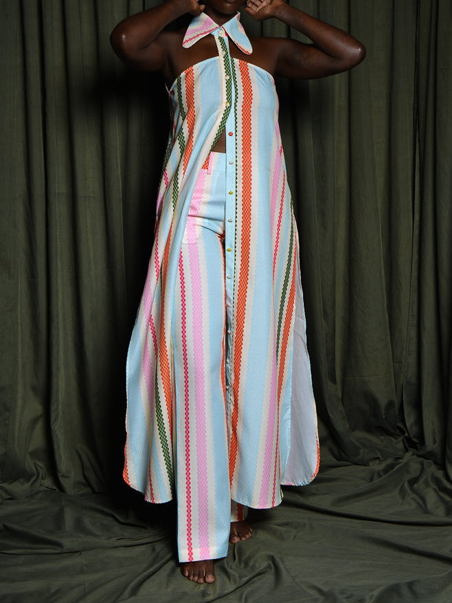 Tailored and timeless, these straight-leg pants feature vibrant multi-colour diamond stripes over a cream and blue pinstripe base. Designed to match the Cut-Out Maxi Shirt Dress, they offer a clean silhouette with a crisp, lightweight feel. Perfect worn as a set or styled solo.