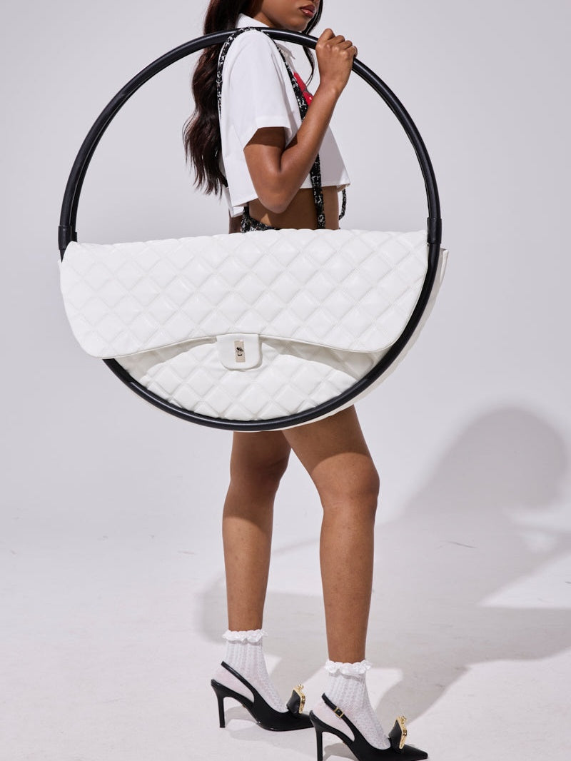 The Oversized Bag is a bold, avant-garde accessory featuring a sturdy, circular black frame that surrounds a large, quilted purse pouch crafted from supple faux leather. It features a flap-top design with a silver twist-lock closure and a supremely spacious, fully-lined interior that can accommodate even your bulkiest essentials.