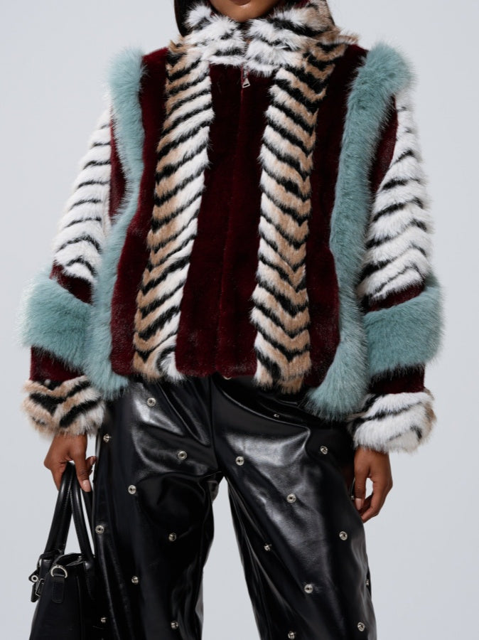 This Fur Coat is crafted from a luxurious faux fur base and features a multicolored paneled construction, a standing collar, long sleeves, and a sleek inner lining. Complete with a faux silver metallic front zipper closure with inner faux leather trim, and a boxy, slightly cropped silhouette.