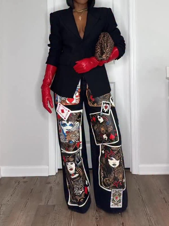 These fabulous bottoms are crafted from a non-stretch, cotton denim base and features a dark wash colorway, a mid rise waistband with functional belt loops and adjustable strappy accents, a classic five-pocket design, and stunning playing card-inspired graphics and embroidered patches featuring powerful, feline women imagery with sequin, rhinestone, and beaded embellishments throughout the pant legs and on the rear pockets. Complete with a classic button-zip front closure, and a relaxed, wide leg silhouette.