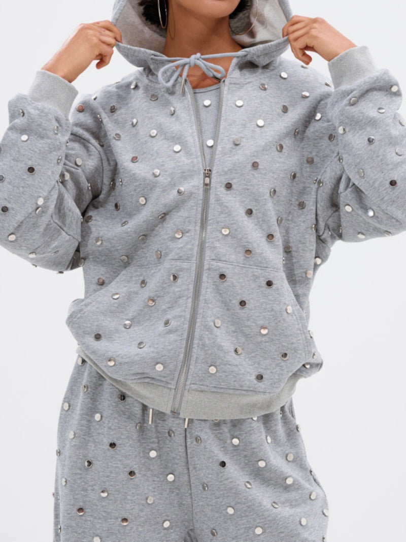 The Zip-Up Sweatshirt features a relaxed silhouette, an attached hood with adjustable drawstrings, long sleeves with cinched cuffs, front pouch pockets, and flat-faced, silver-tone stud embellishments throughout.