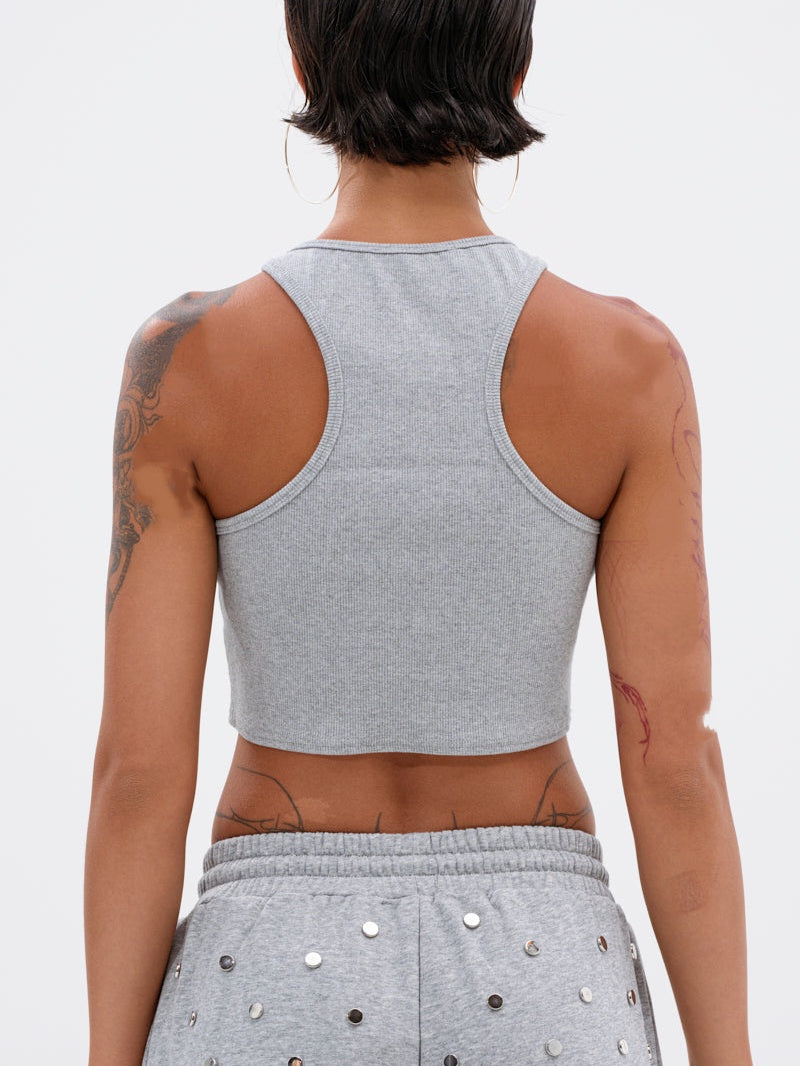 Crafted from a soft, stretchy cotton blend, the tank features a cropped, form-fitting silhouette, thick tank straps, a scoop neckline, and flat-faced, silver-tone stud embellishments throughout.