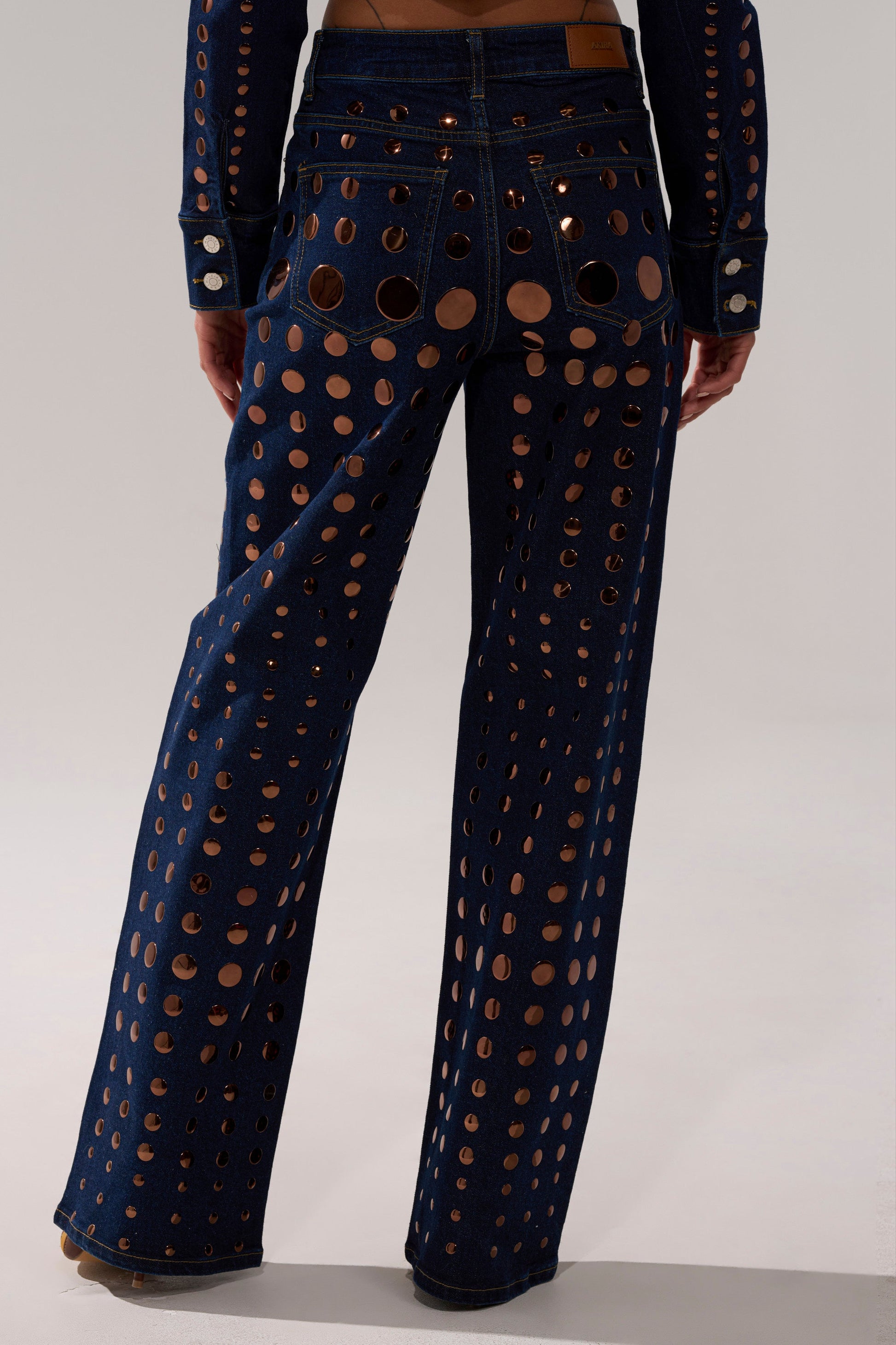 Crafted from semi-stretchy, dark-wash denim, these high-waisted bottoms boast functional belt loops, a classic five-pocket design, a button-zip front closure, and a classic wide-leg silhouette. They’re completely adorned in high-shine, metallic gold circular embellishments.