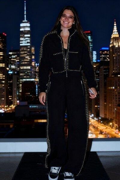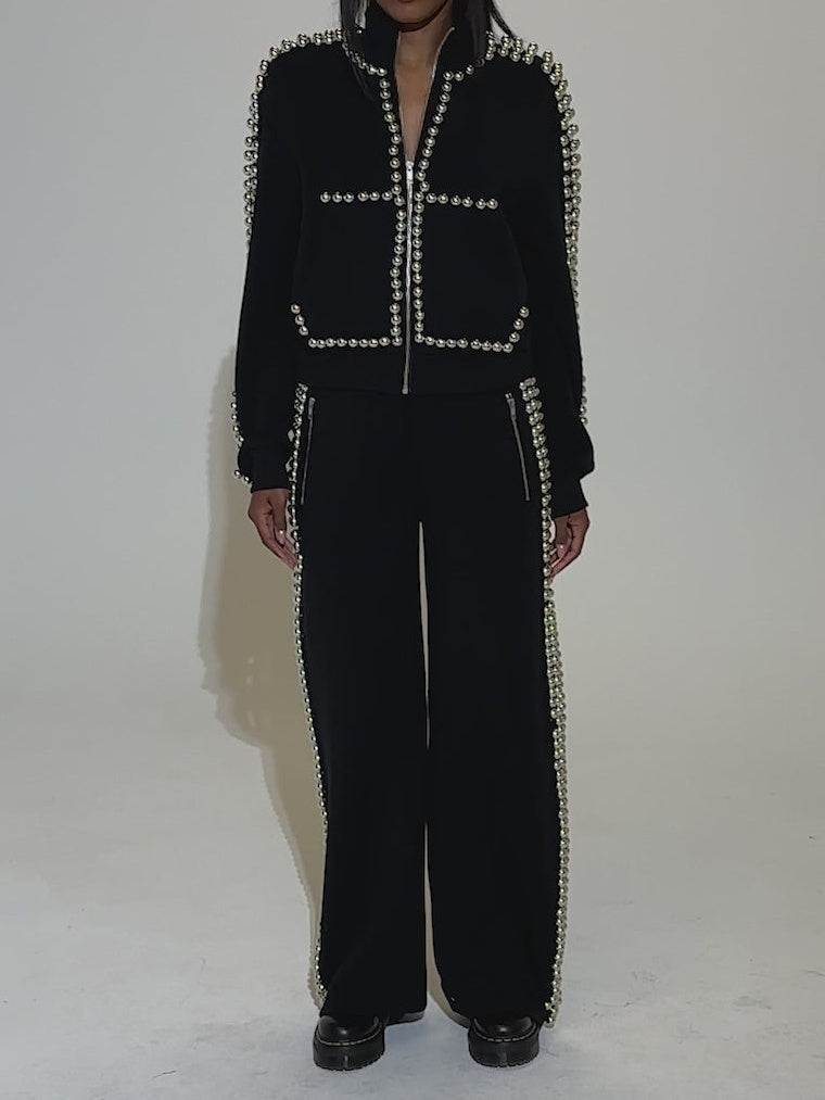 Crafted from a soft and stretchy, heavyweight knit blend, this statement jogger features a high-rise elastic waistband, zippered side-seam pockets, and metallic gold-tone ball embellishments that trail from hip to hem. Complete with a relaxed, wide-leg silhouette.