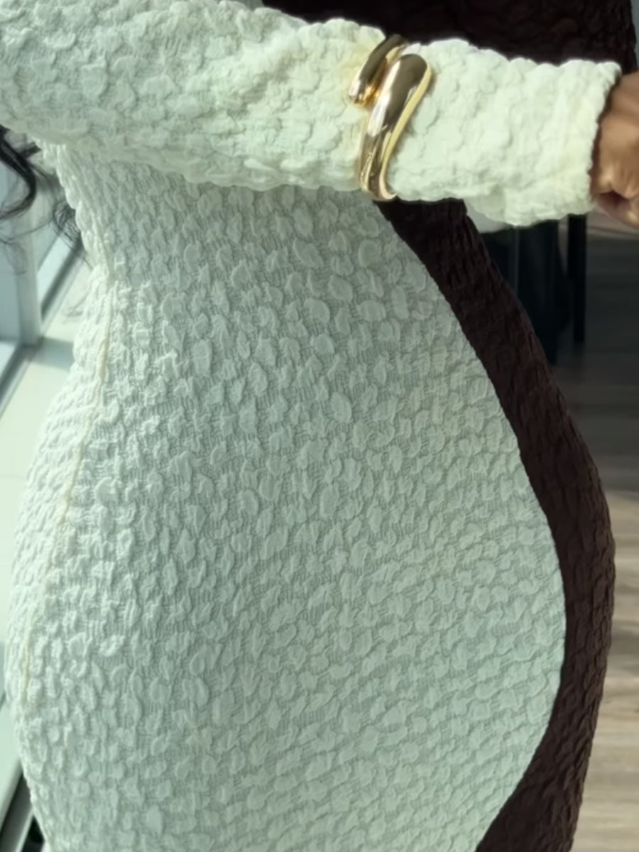 Our dress is our newest unique design midi dress that features a color block texture.