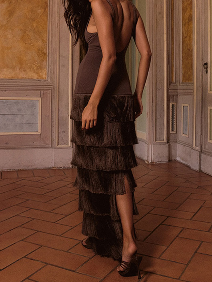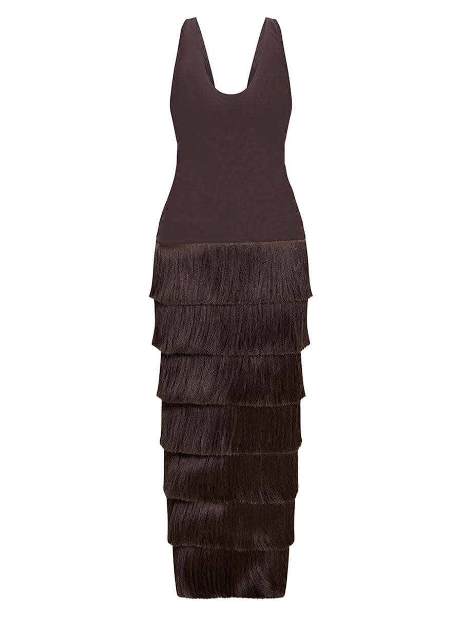 Tailored from dark chocolate toned mesh, this dress has fringe detailing and a maxi length fit. Let the dress do the talking by pairing this piece with complementing brown heels, a slouchy clutch and gold statement earrings.