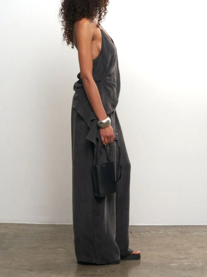 A soft statement piece. Cut in lightweight cupro with an asymmetrical shape and fluid drape through the side. Finished with an adjustable tie at the neck.