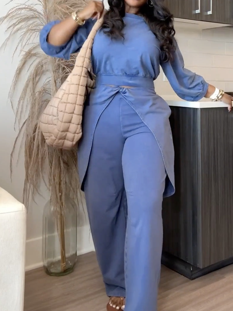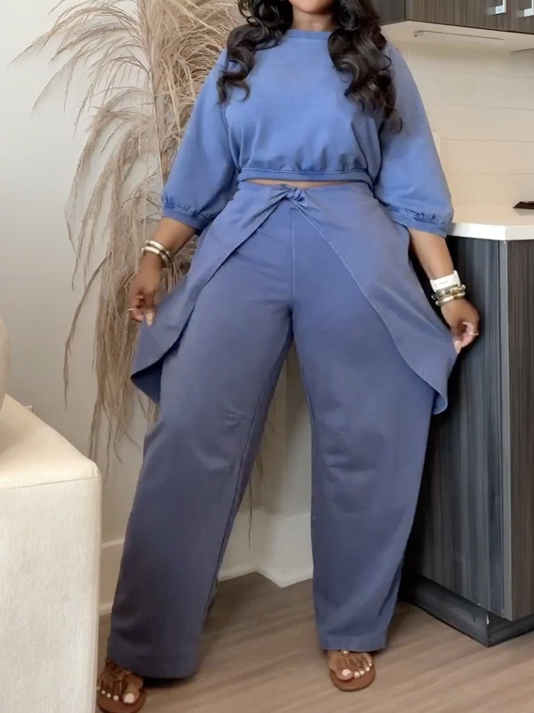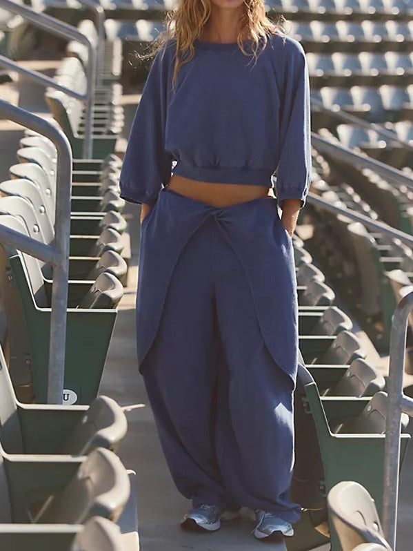 Features: Comfy cotton construction; pull-on wide leg pants with drapey twist overlay detail; slip pockets at the waist; wide legs with slouchy hems; pull-over top with 3/4-length sleeves; ribbed trim; light pleating at cuffs; zipped pocket at upper back.