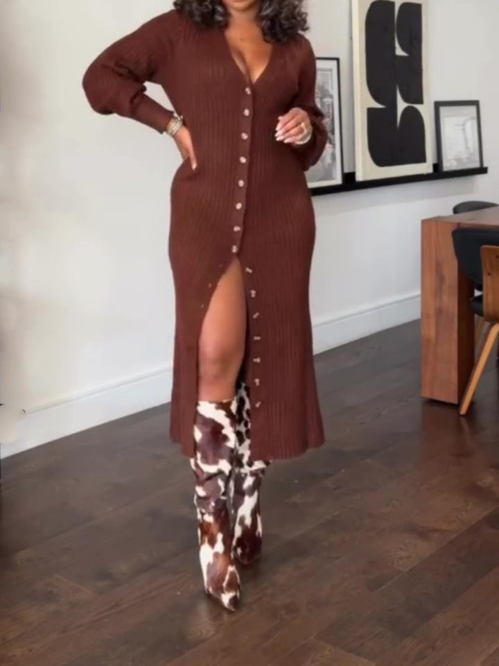 The v neck design with button down closure adds versatility, allowing different styling options. It can be worn open as a duster cardigan or buttoned up as a maxi sweater dress. Pairs well with leggings, jeans, and fitted tops for a chic, put-together look.