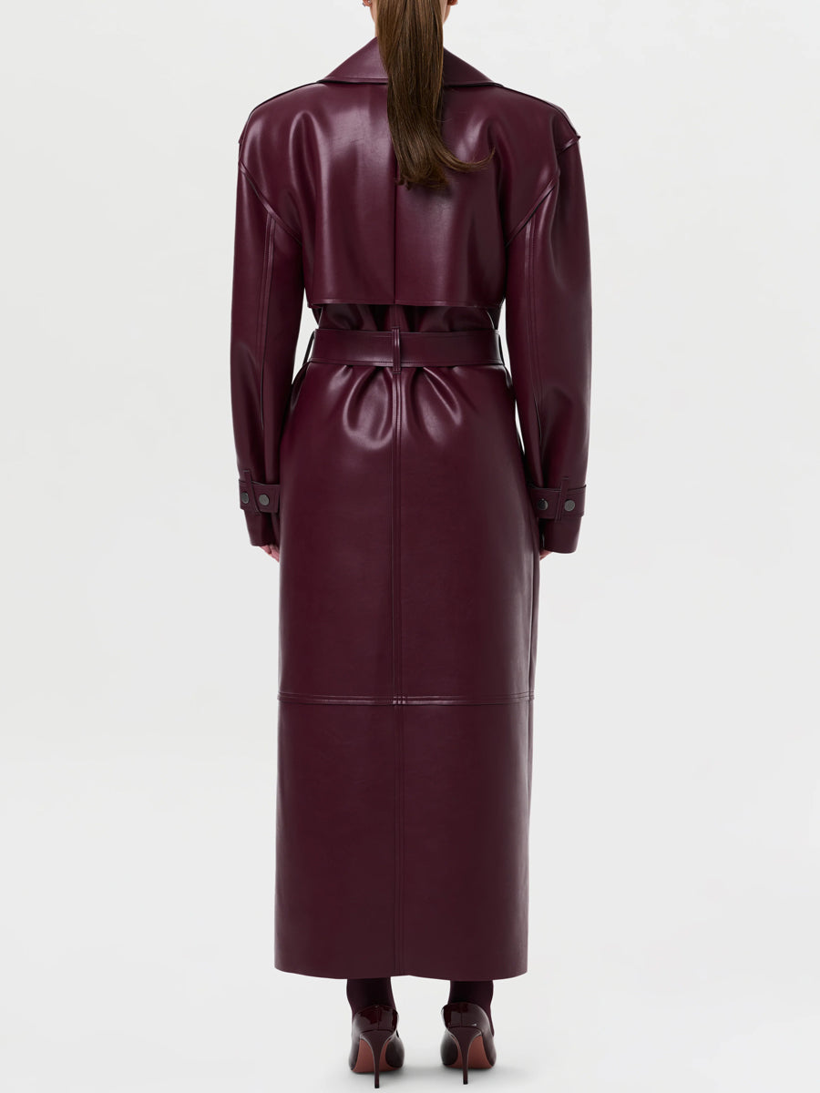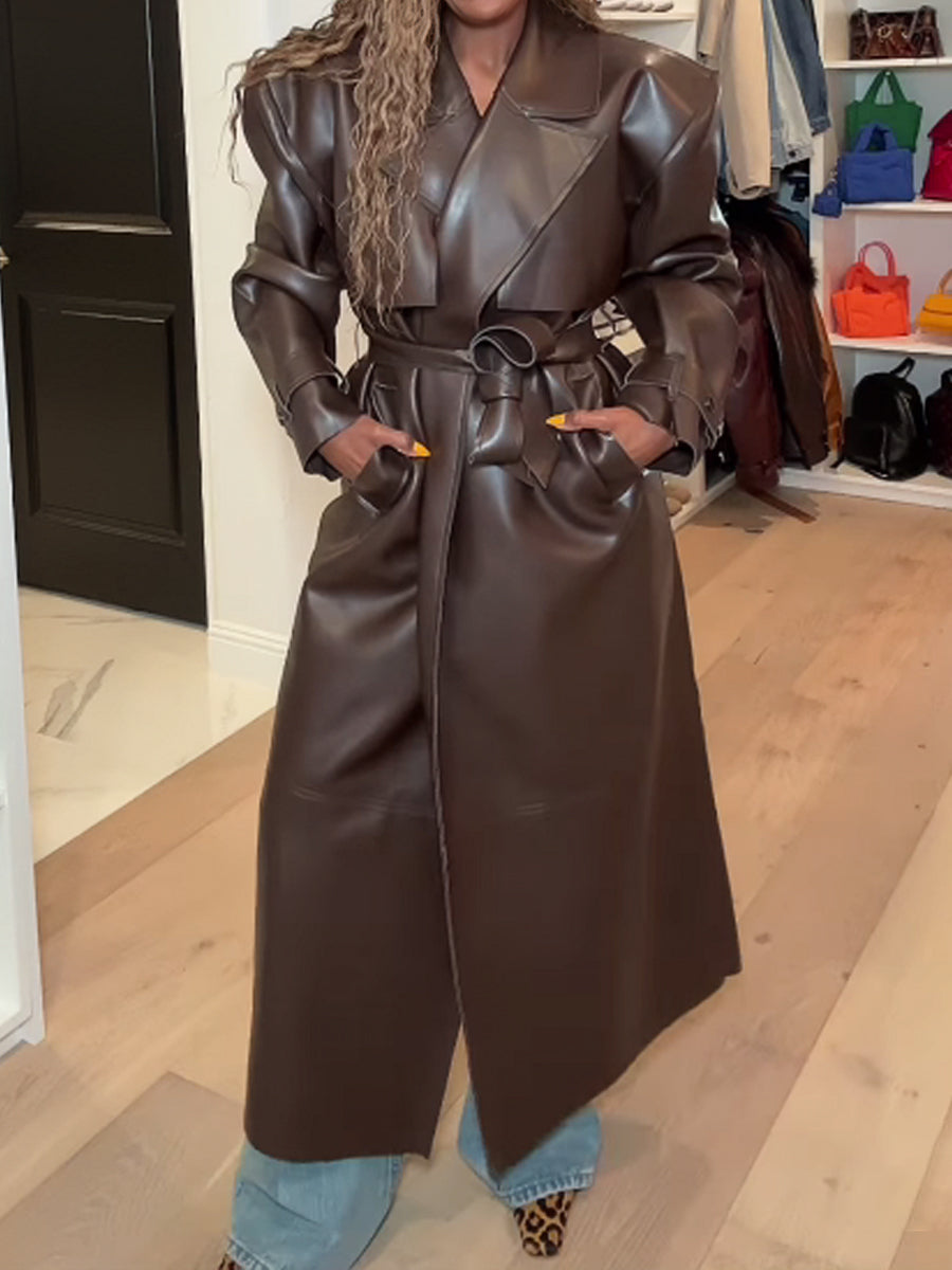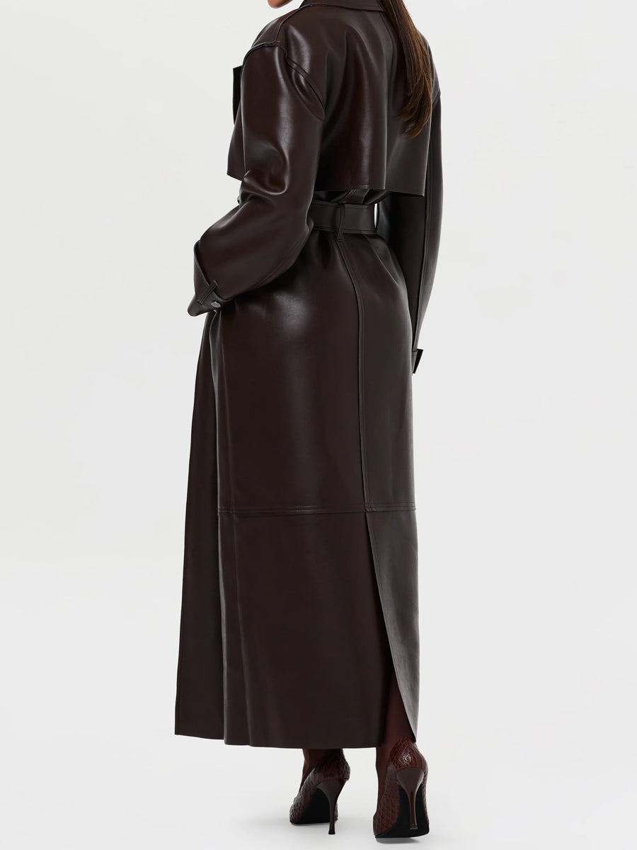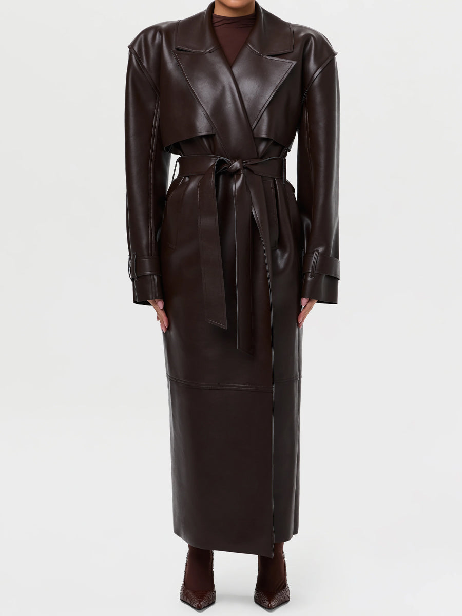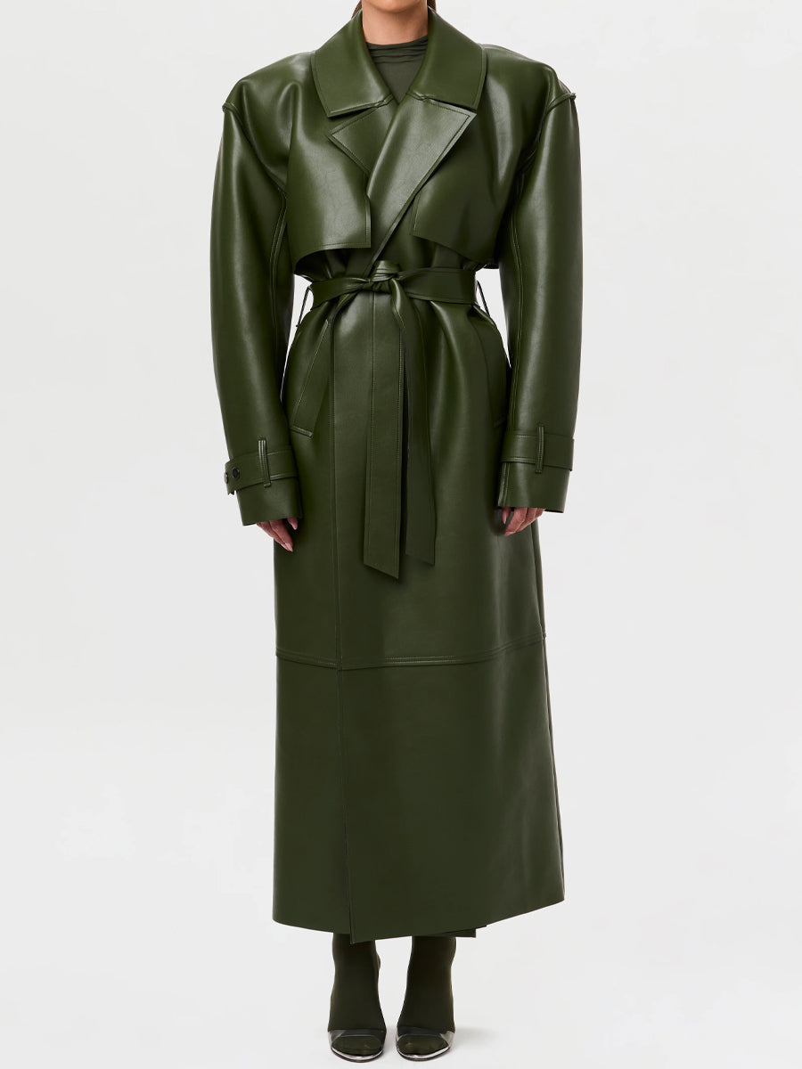 Our leather oversized trench coat are what Fall and Winter dreams are made of! Designed with a luxurious smooth and buttery feel, notched collar and lapel, power shoulders, belted tie closure at the waist and back storm flap detail. Raw edge trim and adjustable hardware at the cuffs with loops complete the look. This is the perfect wardrobe staple to wear on rotation.