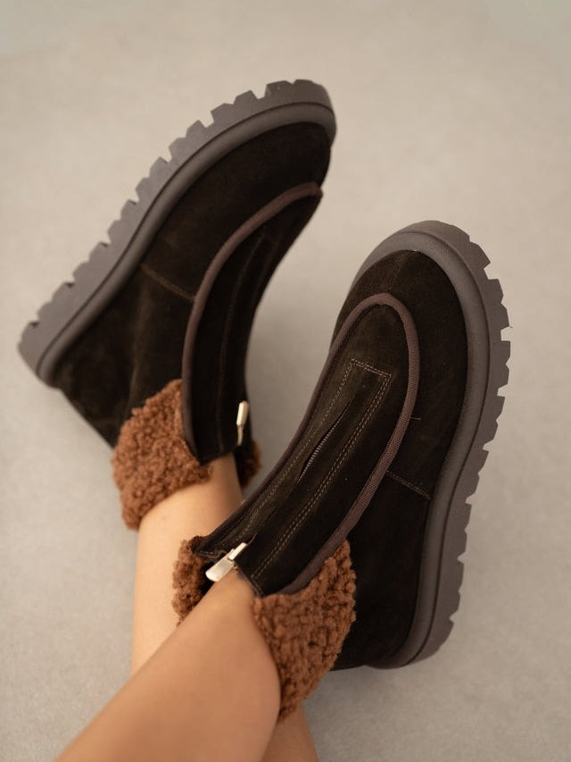 Women's Suede Boots With Front Zipper Detail And Fur Lining