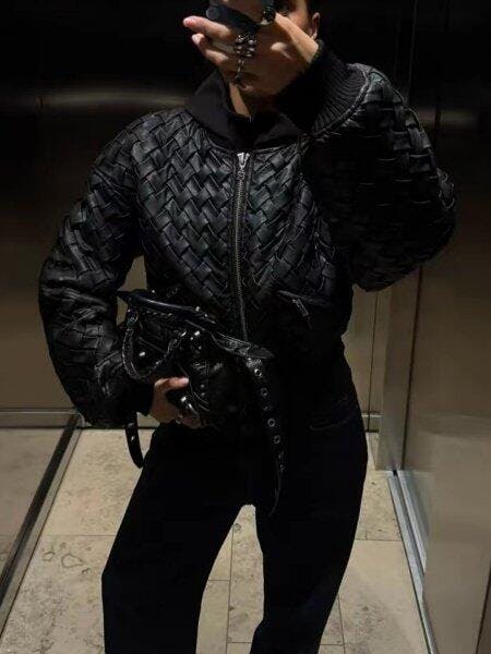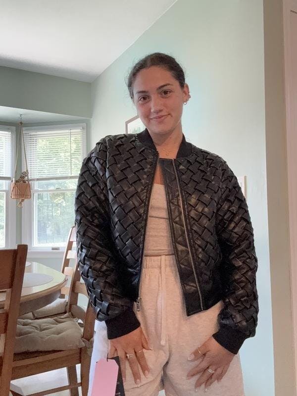 I absolutely adore this bomber jacket and can't wait to wear it. The jacket looks like real leather and the woven pattern is stunning. In my opinion it fits true to size